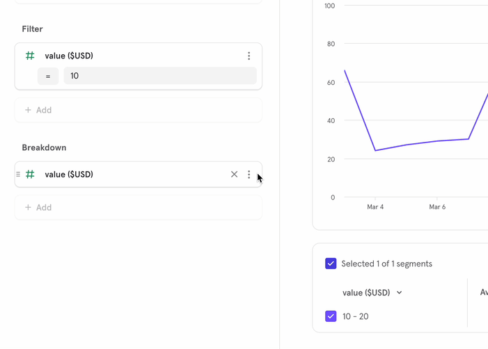 Insights will automatically bucket high-cardinality segments of number data types into ranges.